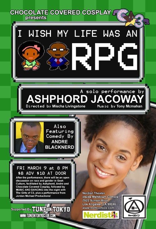 MY ROOMMATE and all-around awesome woman ASHPHORD JACOWAY (who you may recognize from The Tester Season 3) is performing her one-woman show “I Wish My Life was an RPG” at Meltdown Comics on Friday, March 9th at 8 PM.