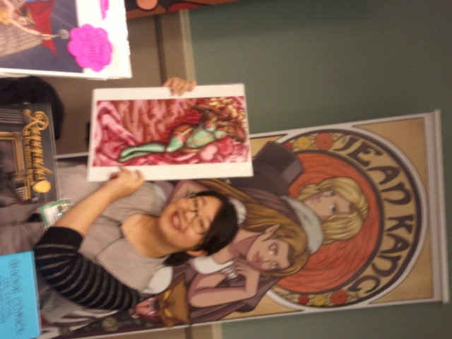 Jean Kang captured my heart with her funny portrayal of Superman and Batman’s relationship, her female superhero-centric work, and especially her pin-ups! Each print formed a connection for me, and I will be looking for her at the next convention so I can buy all of them!