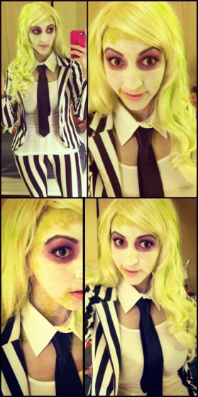 What inspired this post was my direct experience with needing a Halloween costume quick. Vertical black and white stripes are in fashion right now, it seems, so I picked up a blazer and leggings in that pattern, already had a plain white tank, got a cheap black tie, had the collar, found a white wig (easily had at a Halloween store), grabbed some green hair spray dye to dirty the wig up a bit, grabbed white and green face paint (also easily had at a Halloween store or even the local CVS at this time of year), used some purple eyeshadow I already owned, and voila, Rule 63 Beetlejuice:
