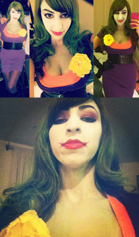 I then accidentally left my wig at a friend’s and had another night of Halloween fun, so I tried spraying my hair green for Beetlejuice. Instead of Beetlejuice, I was looking a lot like someone else, and I only had an hour before having to leave the house. So I searched in my closet and found similar colors that would create enough visual connection in order to be: