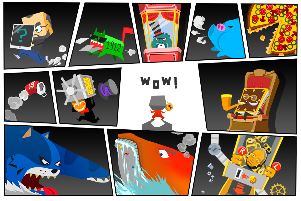 As an endless runner/platformer, this game is obviously less about plot and more about gameplay, but getting locked into the face box definitely caught my attention and made me want to figure out what was underneath and why I had been locked up. As you progress through the game and unlock more levels, you also unlock more representations of the people who worked on the game – from that point on, they will just hang out in the main menu. Presumably at the end, you will find out who you really are under the mask (I feel like it has something to do with the people you meet along the way), but I haven’t gotten there yet.