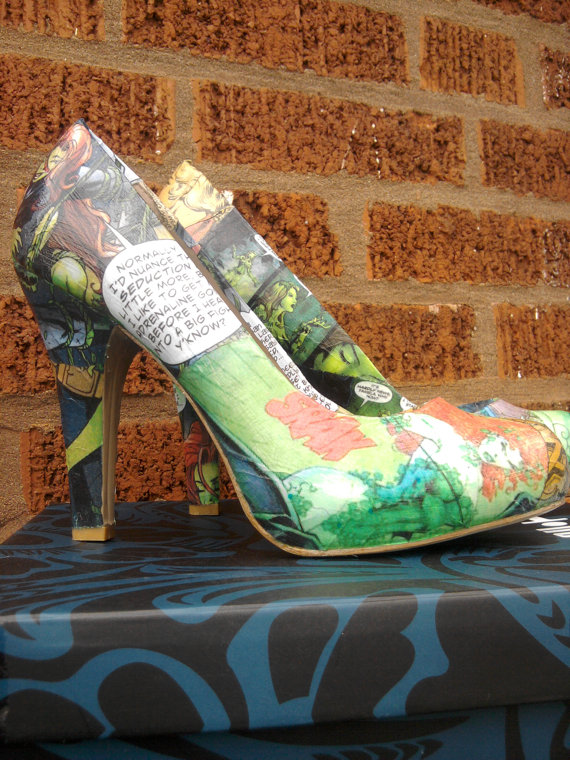 There are several pairs of awesome geek heels over on Faith is Fabulous. I love that The Walking Dead heels don’t have an obvious label on them and are thus very subtle. The Poison Ivy and Wonder Woman heels, though modge-podge, are very well thought-out, with consideration given to the placement of images.