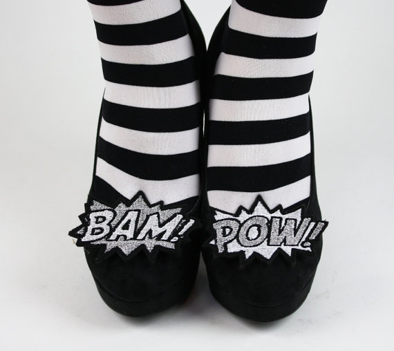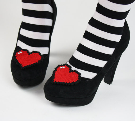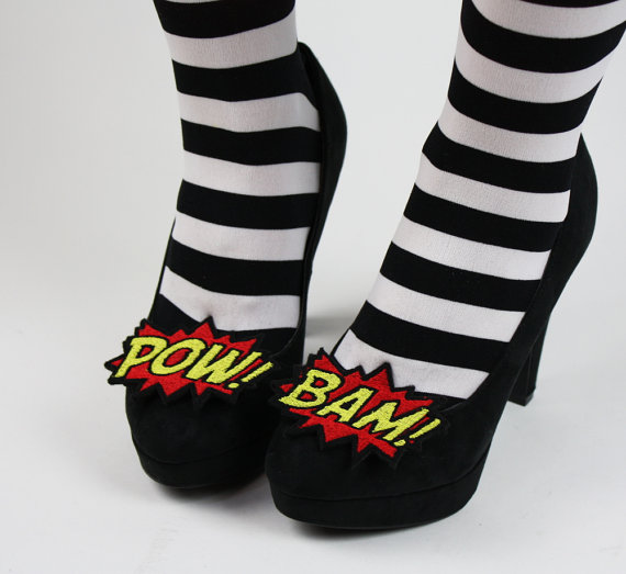 Finally, if you don’t have a ton of spending money but want to geek up your shoes, you could always use these 8-bit and comic-inspired shoe clips from Janine Basil.