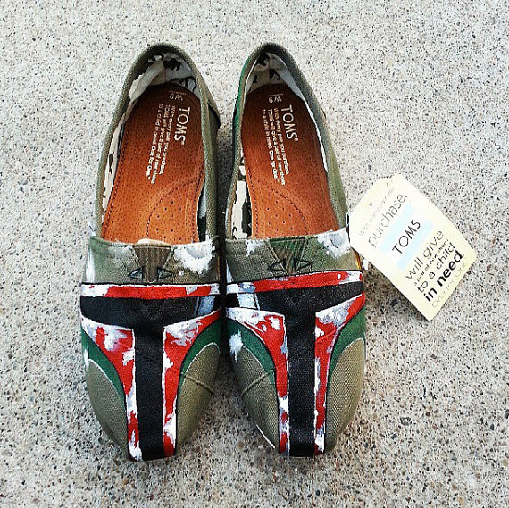 I love these two Star Wars options, as they capture the iconic look of each helmet on a shoe! Stormtrooper kicks are from Shoes by Smiley, and the Boba Fett kicks are from East Bay California.