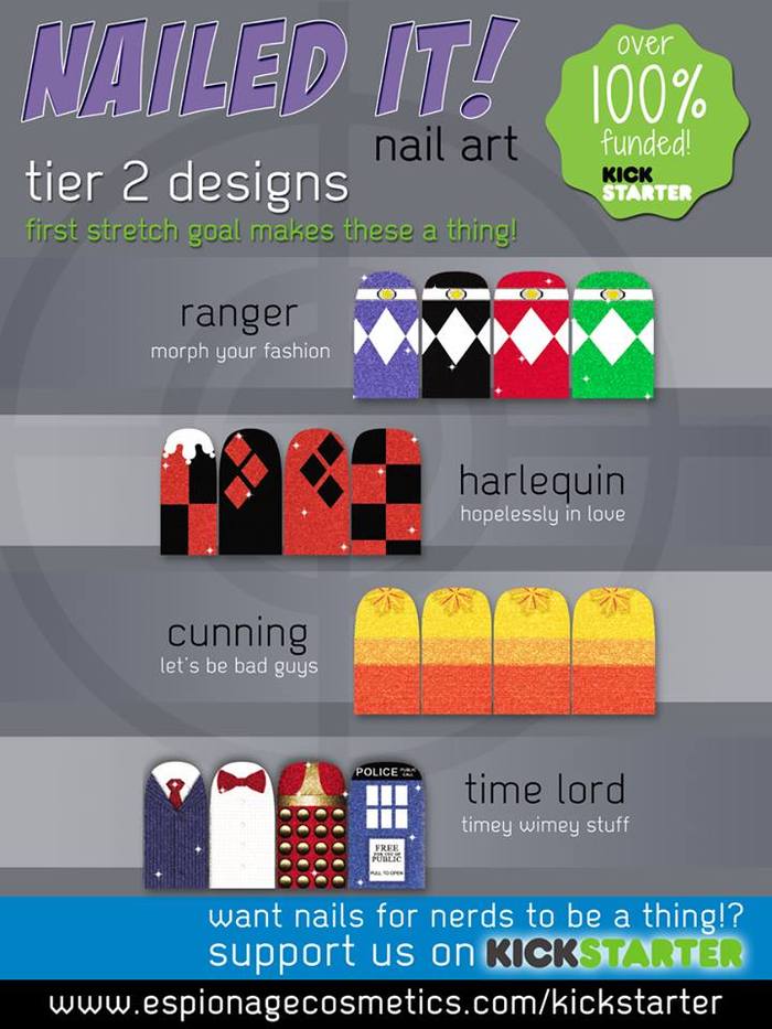 They feature some wonderfully bright cosmetics with geeky names to boot (and you can check those out on their site). What’s next? Geeky nail wraps! Espionage created a Kickstarter earlier this month hoping to bring us geeky nail wraps and they met their goal. In fact, they surpassed it, and released additional designs. The Kickstarter is still going strong, and there are more designs that could be unlocked if they get more funding.