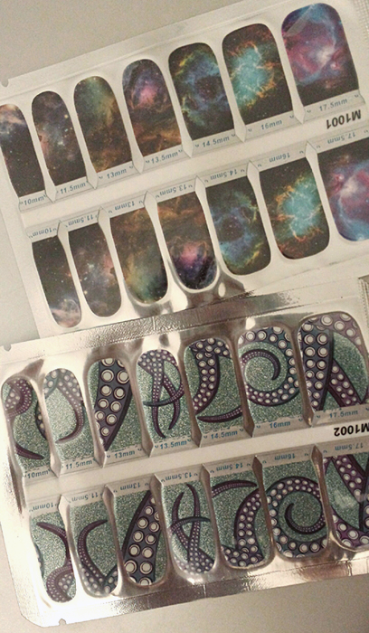 If you’ve ever used nail wraps/stickers before, these work exactly the way the rest do. You remove the top transparent protector, peel the wrap off the backing, line them up with your nail, then file away the leftover. I adored both the nebula and tentacle nail wraps immediately, but decided to try the tentacle nail wraps first (I have plans to wear the nebula nails during PAX Prime):