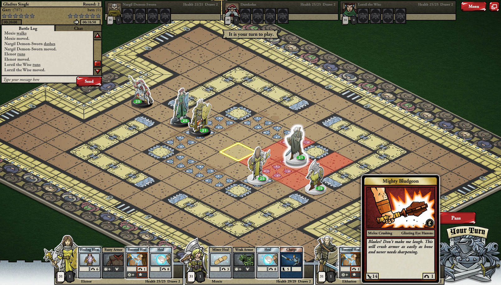 There is also a multiplayer option, where your adventuring party fights another real person’s adventuring party. You join a queue to fight, and the more you win, the better chests you get. The games are also on a twenty-minute timer, so neither player can take forever making a decision.