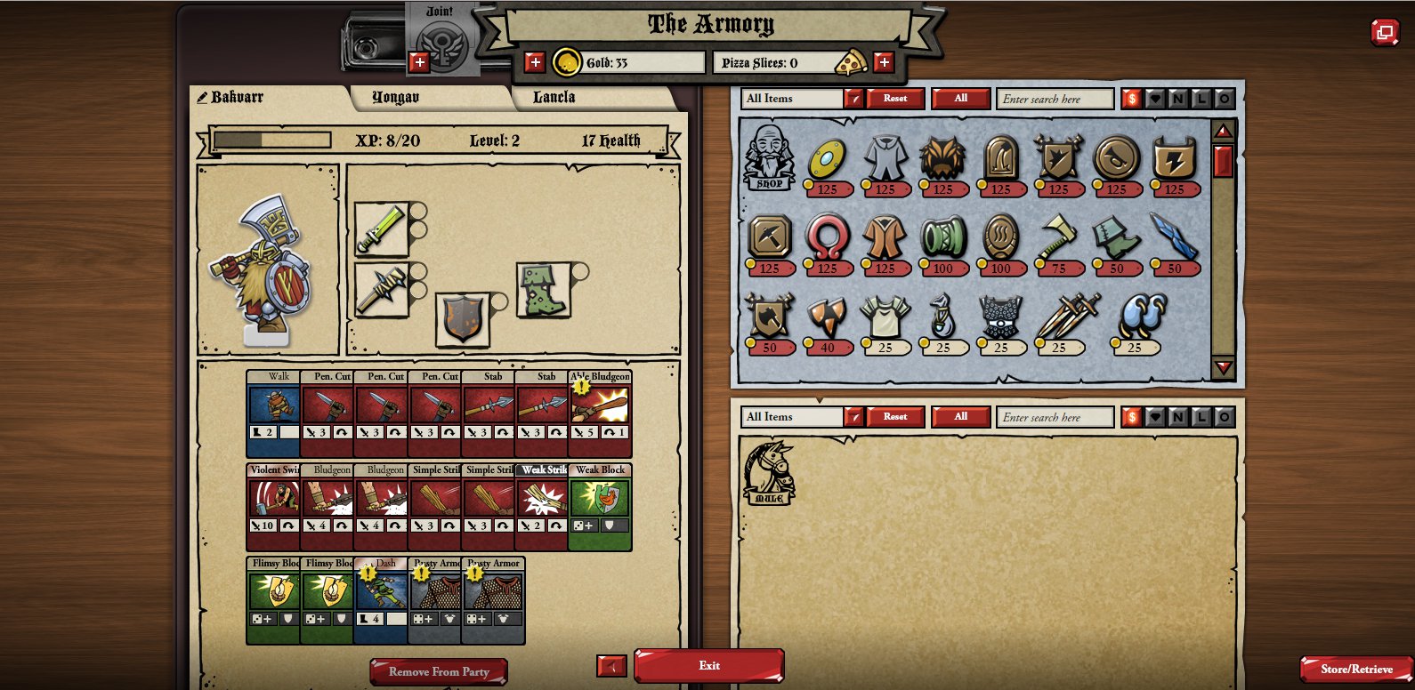 After an entire battle, you get a treasure screen! Your characters get experience and level up, and then you get to open a chest. In the chest there might be non-wearable items that you can sell off and get gold for, or there might be equip-able items. Sometimes you get things that are better, and sometimes you just go sell things. You can also buy items from the store to help outfit your party. As your characters level, they also gain new slots. For instance, the characters don’t start with an armor slot, and only get one after leveling up.