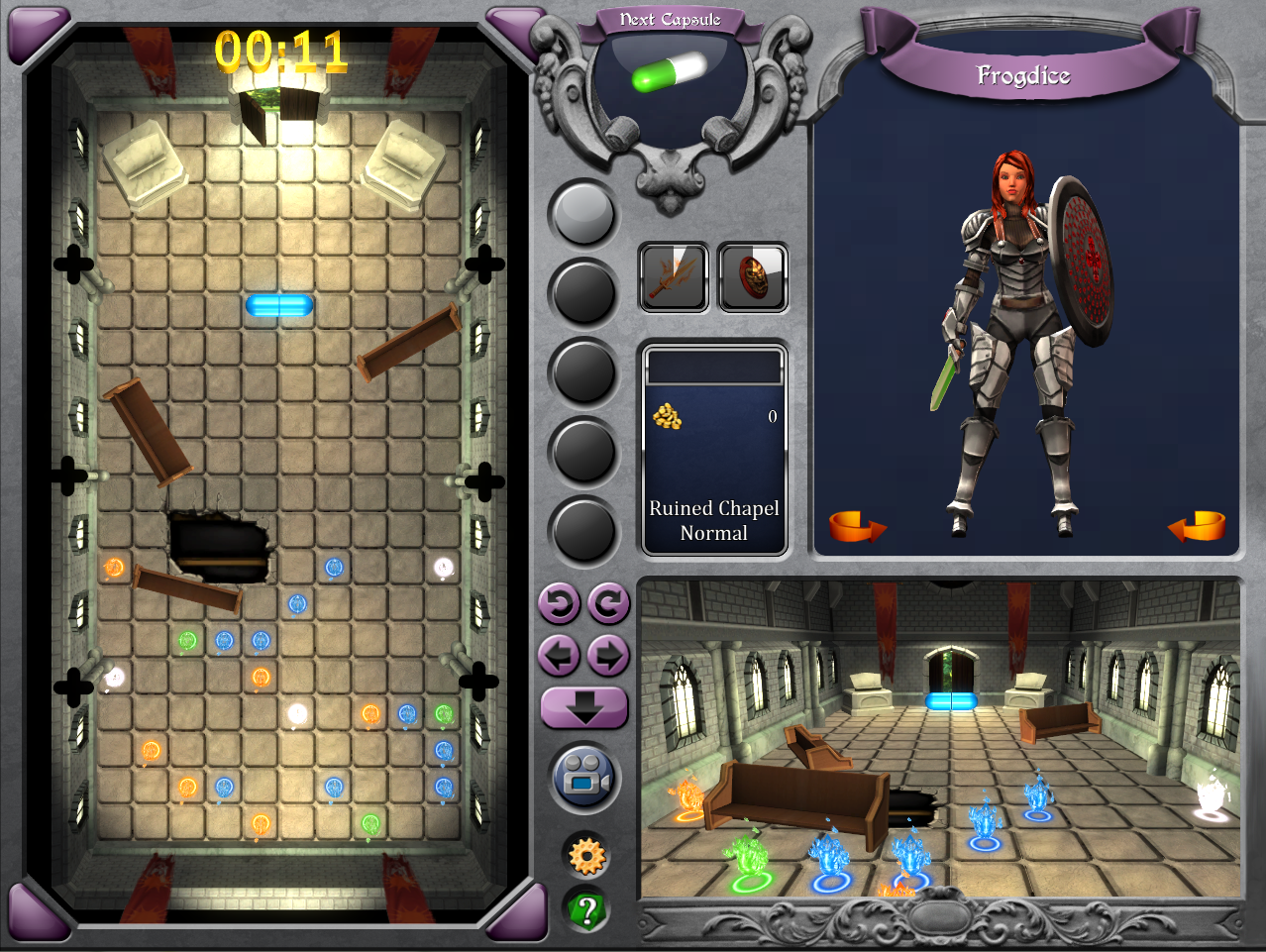 The game begins with character creation, and you can tweak your gender and how you look before heading out into the world. (Minor complaint: the girl model has super-cleavage at the start, but you can quickly cover her up, if you want to, with armor and clothes that will drop in the dungeons, as above). You get a very nice tutorial, then you’ll travel around the map clearing dungeons by playing a Tetris-influenced game. The falling pill can rotate around, and when you make a group of four of the same color, you clear them. You can also attack individual monsters with your weapon, but there’s a significant cool-down time. Some dungeons have a boss, which can be attacked with any color of pill. My one complaint is that sometimes a level will drag on forever because of the random element of what color pills you get. Some levels have holes you can drop pills down that you don’t want, but that doesn’t work for every level. The game has fifty in-game achievements.