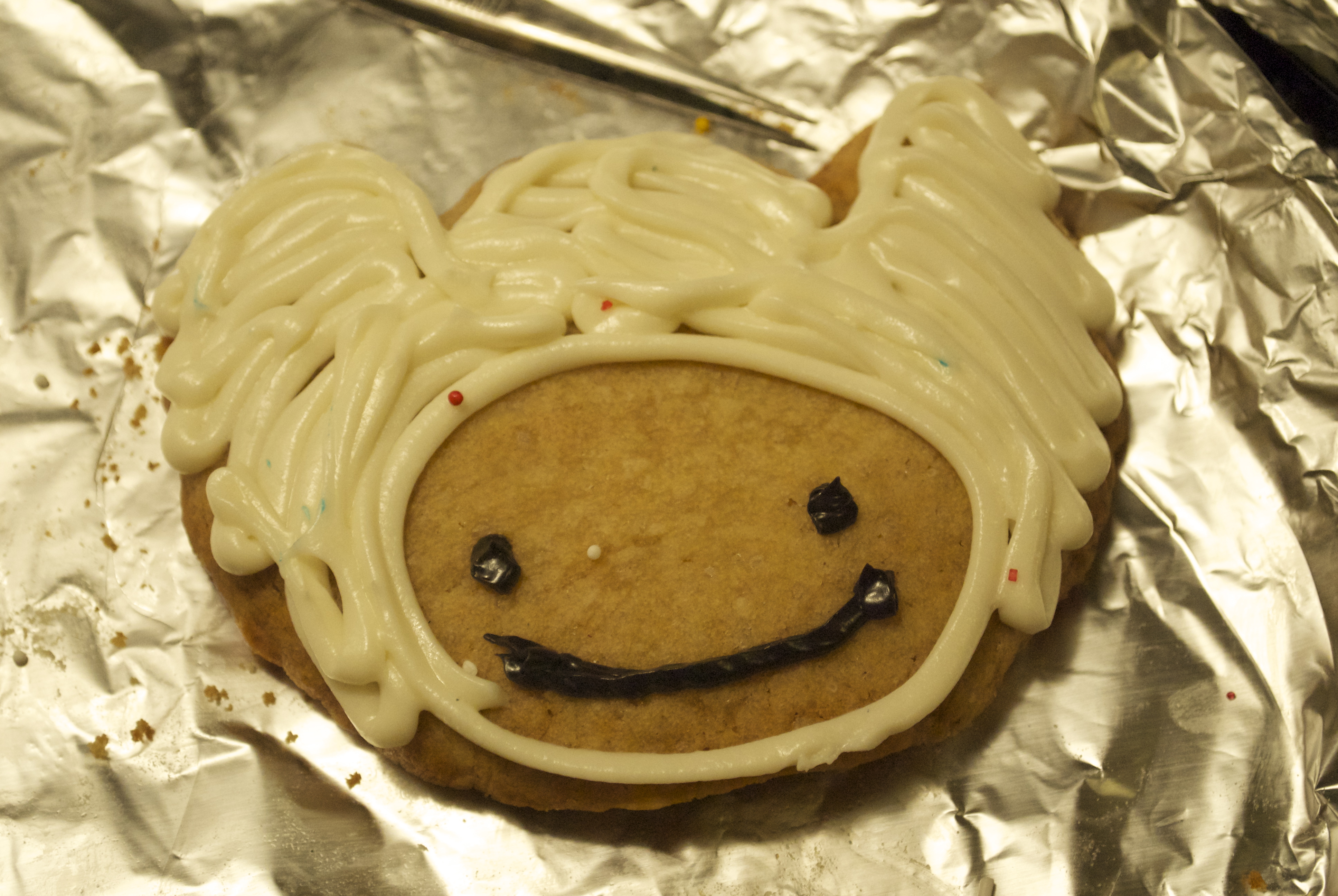When you go about decorating, find the most iconic symbols and colors for your geeky item/character that you’re immortalizing in icing. It’ll be more general, but it’ll translate much better on a cookie. If you get too over-zealous, you’ll end up with a mountain of frosting and sprinkles that resembles Snuffleupagus vomit.  So here are some simple cookie designs I made for your benefit and use: