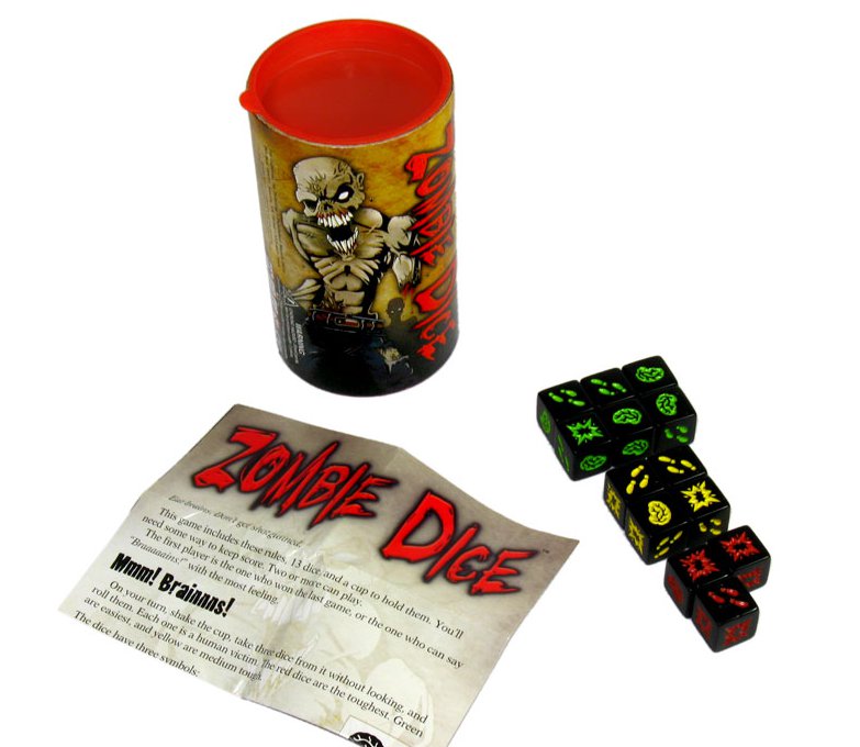 Braaaaaaains…the whole point of the game is to eat the most brains, but to not get shotgunned in the process. Each time you roll, you risk getting the shotgun symbol. If you get three shotgun symbols in one round, you lose all the brains you’ve collected and pass the game on. There’s a fun mix of strategy and luck to this one, and like the other two, it only takes about 10-20 minutes to play.