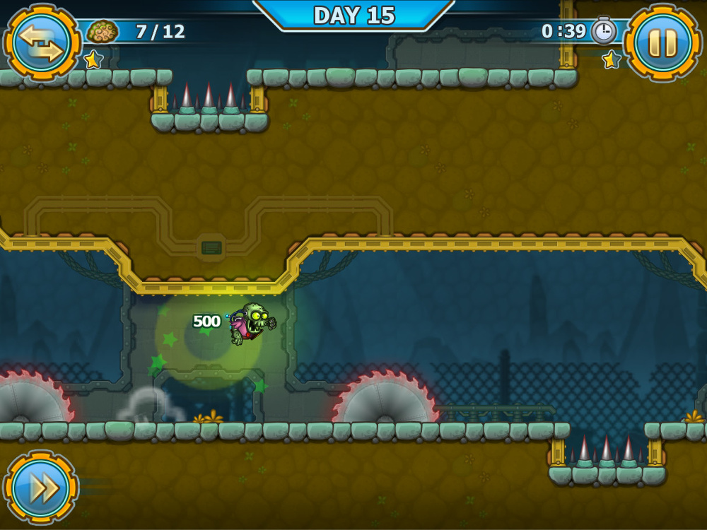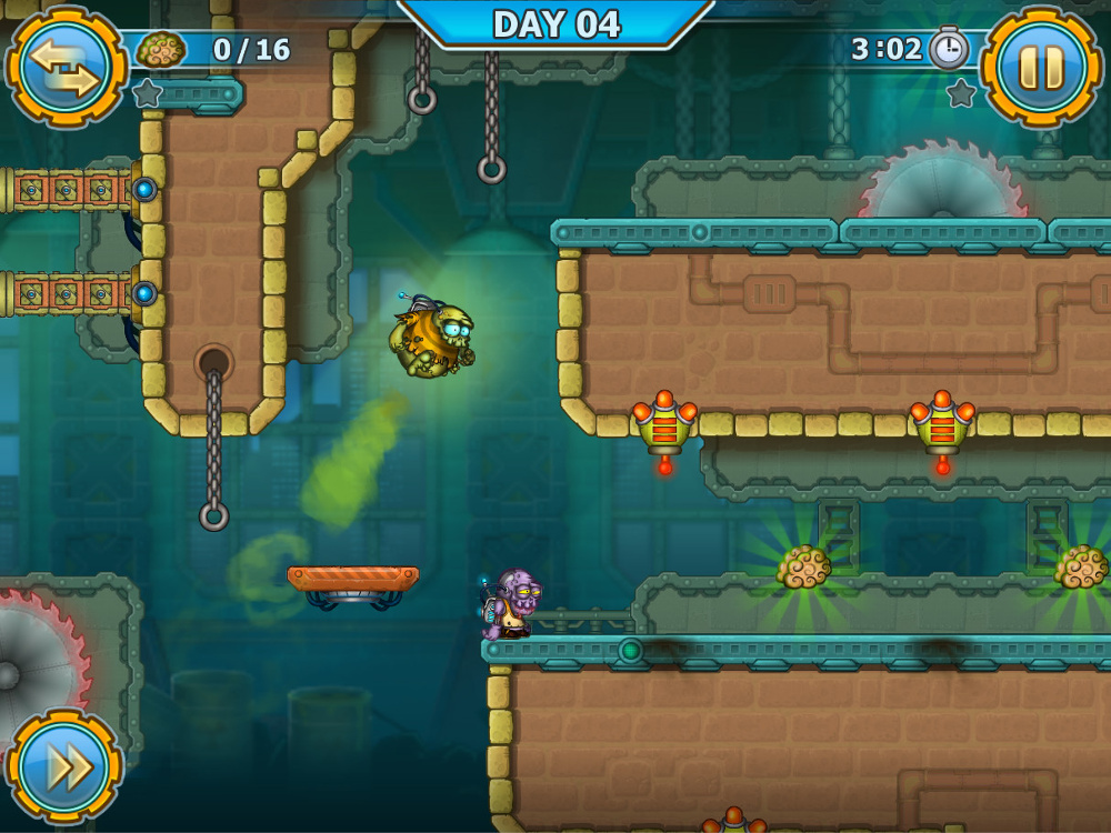First, you pick your level from the blueprint map; there will be 100 levels to play through in phases of 15 each. Each level allows you to earn up to three stars (much like Angry Birds). You earn stars based on time, getting to the end of the level, and how many brains you eat. You’re able to replay levels to up your star count if you don’t get all three the first time. If you’re having a problem with a level, you can pay to skip it.