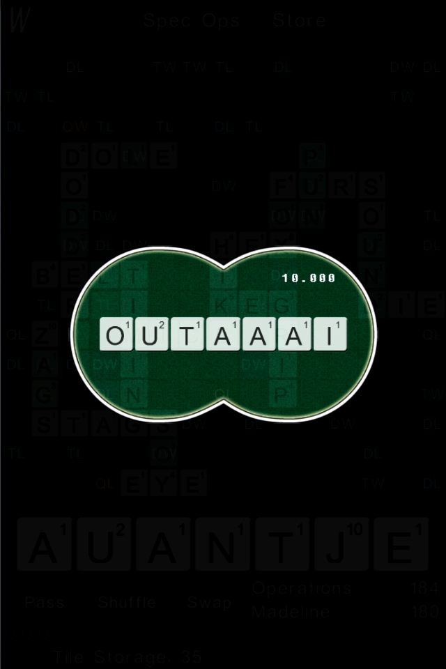 There is no sound to speak of in the game, which I found odd – no clacks when you place the tiles, no wheel spin noises, nothing. [Note: The developer let me know that sounds are forthcoming in a future update!] The game board is black and white for the most part, with the exception of the multiplier tiles, which are blue, red, and green. The graphics for the Special Operations are well-done and crisp, and the interface is easy to get used to.