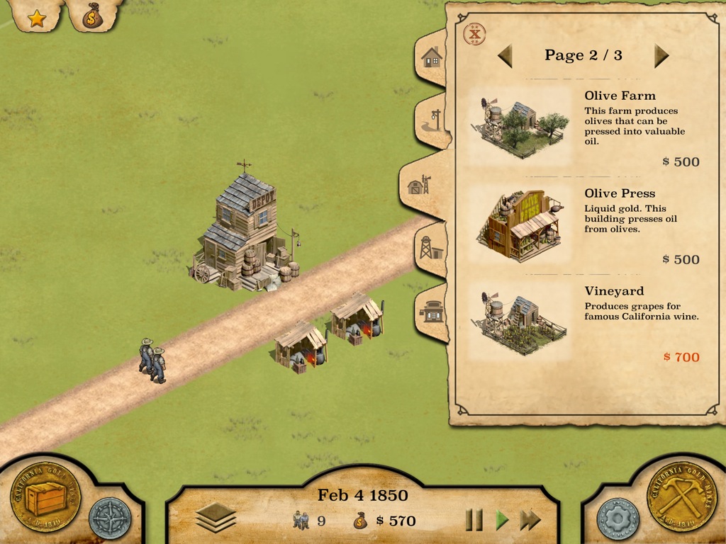 Cities in California play host to tiny towns where you’ve recently become the mayor! Congratulations! The player is also given a couple objectives to fulfill, but initially the game will help the player achieve those objectives. Place houses, workplaces, and public services – like a fire brigade and sheriff – to achieve these objectives. Telegraphs also arrive periodically to offer side goals and commissions. After you master each town, you move to another town and another set of goals.