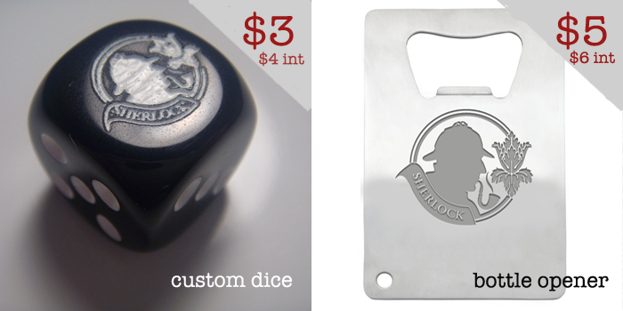 As you can see, it’s all of the Sherlock characters re-imagined as freaking cute animals! Sherlock is, of course, an otter. And Watson is a hedgehog! I love that Irene Adler is a mink, that’s so appropriate! The Kickstarter is also doing really cool custom dice, a bottle opener, and a coin.