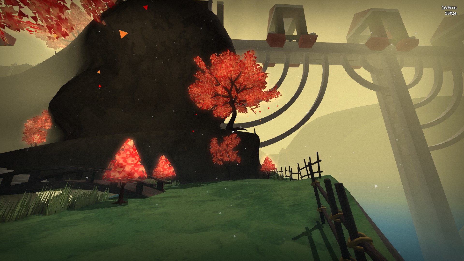 TRI is an interesting game. It starts out with you taking the first-person role of an unnamed woman who finds herself in a Japanese-styled temple high up in the mountains. The place is empty except for a masked monk. The monk says that he’s excited to see you, but that he doesn’t wish to share his story with you until you prove yourself worthy. A quick run through an obstacle course (which serves as the game’s tutorial) solves this, and he proceeds to tell you that he’s the guardian of the temple of the Odd Gods. The temple had been home to a pair of foxes, but the guardian says that his particular fox companion has gone missing. Your quest, as you may guess, is to enter the world of the Odd Gods and track down the fox god, who is somewhere deep within.