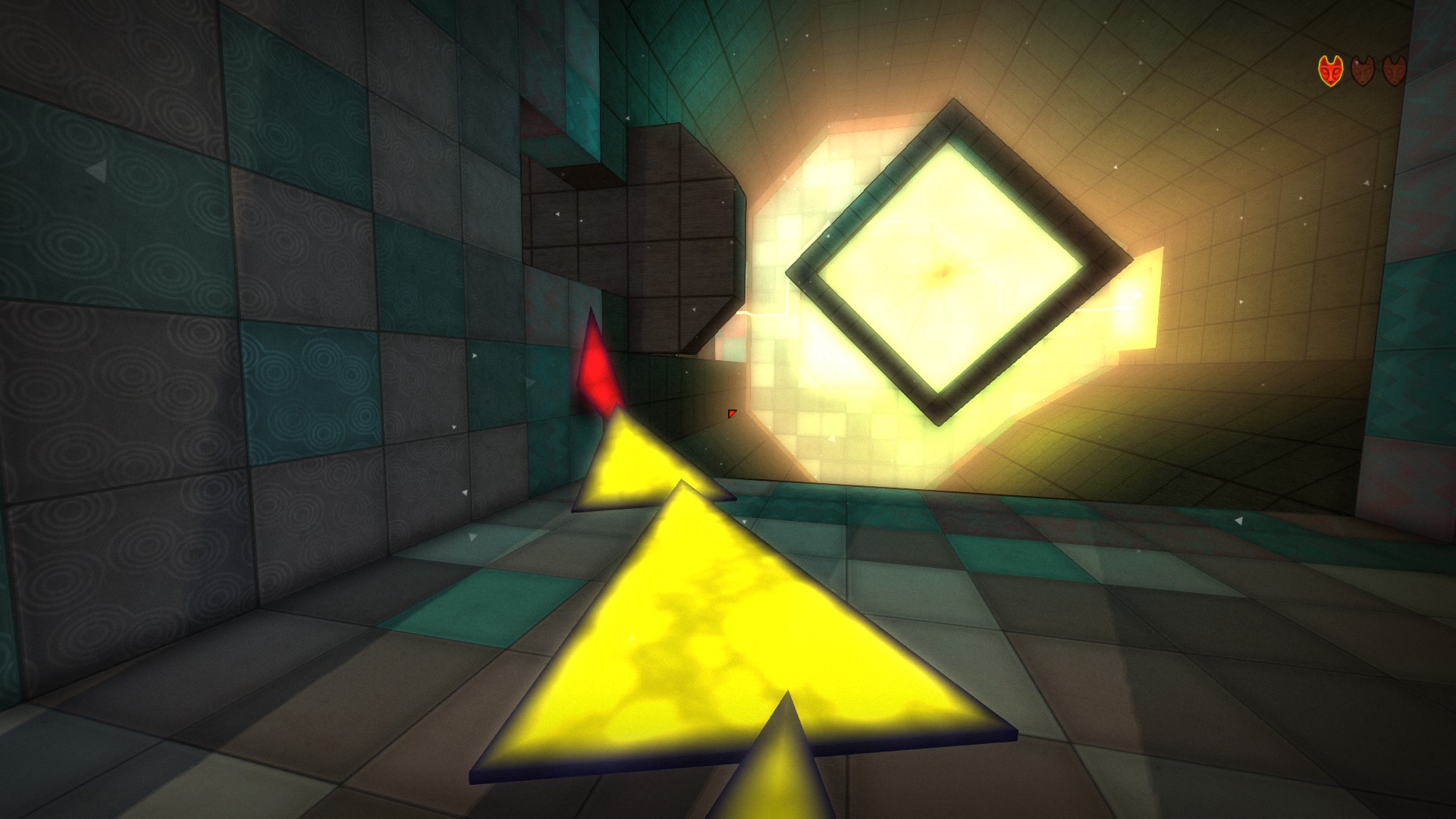 Inside the Tower of Nowhere (the third area of the game), players receive the TRI – a mystical object that can be used to create three-sided objects wherever one desires. This ability can be used to traverse areas that you’d have no way to cross otherwise. When using the TRI, players click to create three distinct points. If the TRI can be stood upon successfully, it will turn yellow. If it’s too steep or otherwise unusable, it turns red. This basic ability is used to progress through the next couple of stages, after which it receives an upgrade that allows triangles to serve as gravitational planes, making their careful placement useful when one needs to walk on the walls or ceiling.