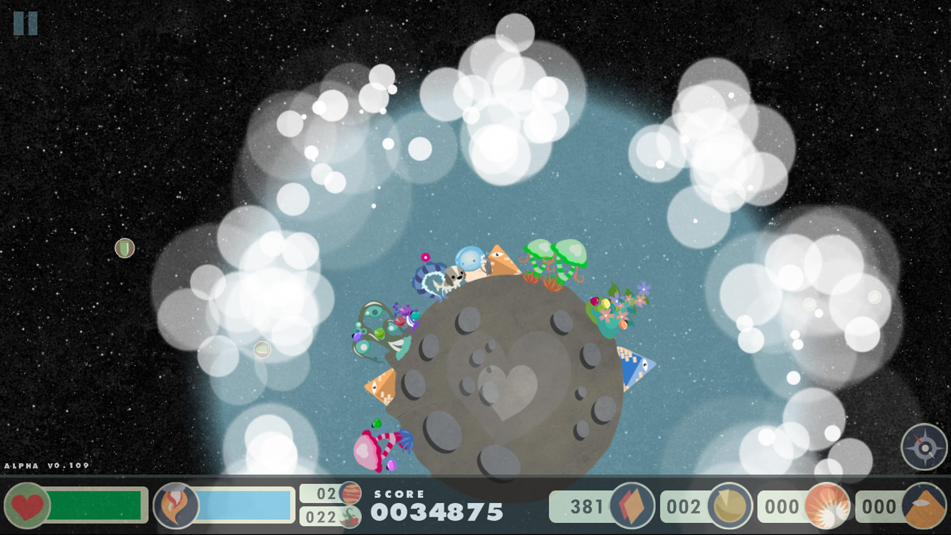 The galaxy is procedurally generated, so every time you play, you’ll see something different. You begin the game on a small planet, and are instructed how to plant your one seed. That seed grows into a plant after a little bit, which will have at least three more seeds. After planting, you’ll see a heart and a shadow heart in the middle of the planet that you have to fill up. Depending on the size of the planet, this could be as few as four plants or can get into the dozens range. All the while, you’re fighting off aliens who are flying around trying to kill you. Killing off the aliens gives you gems, which allow you to buy upgrades. These range from better guns to more fuel for your jetpack. After you completely fill a planet’s heart meter, it transforms from a grey dead world to a beautiful, colorful one. It also heals you of damage you’ve taken. Then it’s off to the next planet to repeat the process! Sometimes you can find bricks, which allow you to make defensive towers and other things for the planet (like an Easter Island statue, for some reason). There are more things to build that I haven’t discovered yet, which makes me super curious.