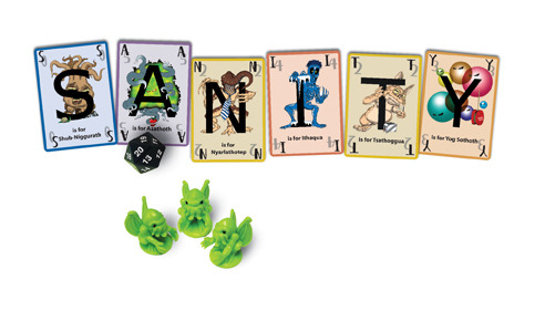 “In the game, you and your opponents will attempt to form words from the letter cards in your hand. Each letter is worth points – the amount of points is determined by the number of angles in the letter (where the hounds of Tindalos are lurking!). You may try to make the highest scoring word possible, but…you’ll have to test the strength of the word against a roll of the 20-sided die. Roll equal to or higher than the value of your word and you’re safe…but roll less than the value of your word and you lose a precious piece of your sanity, represented by an adorable Cthulhu pawn!”