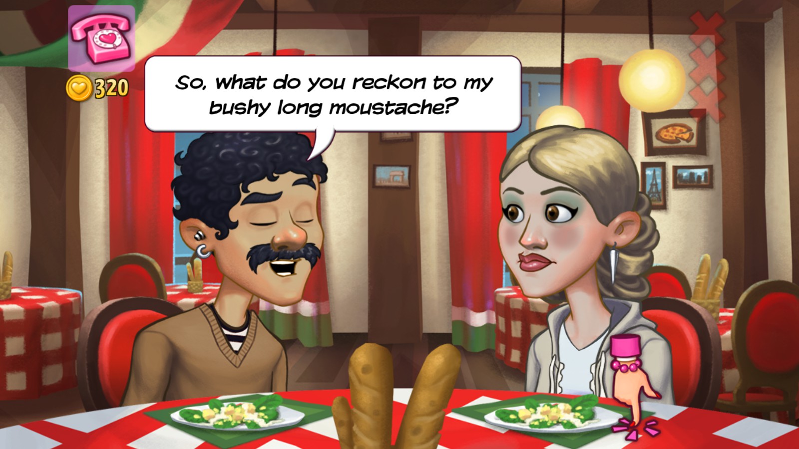 This is a SUPER colorful game, which makes it really fun to look at. All of the characters are pretty varied; there are a lot of customization options for your own character, which are all available for the dating pool characters/customers. This results in a super-diverse clientele – awesome. I love that the pointer is Kitty’s hand; you don’t often see a nail-polished cursor! The interface is super easy to understand without being too cluttered. The sound can, unfortunately, be quite repetitive. There’s not a lot of variation in the soundtrack, and the unintelligible mumblings of your clients and the waiters can be a bit irritating. Kitty herself is great; I wish there was more of her voice!