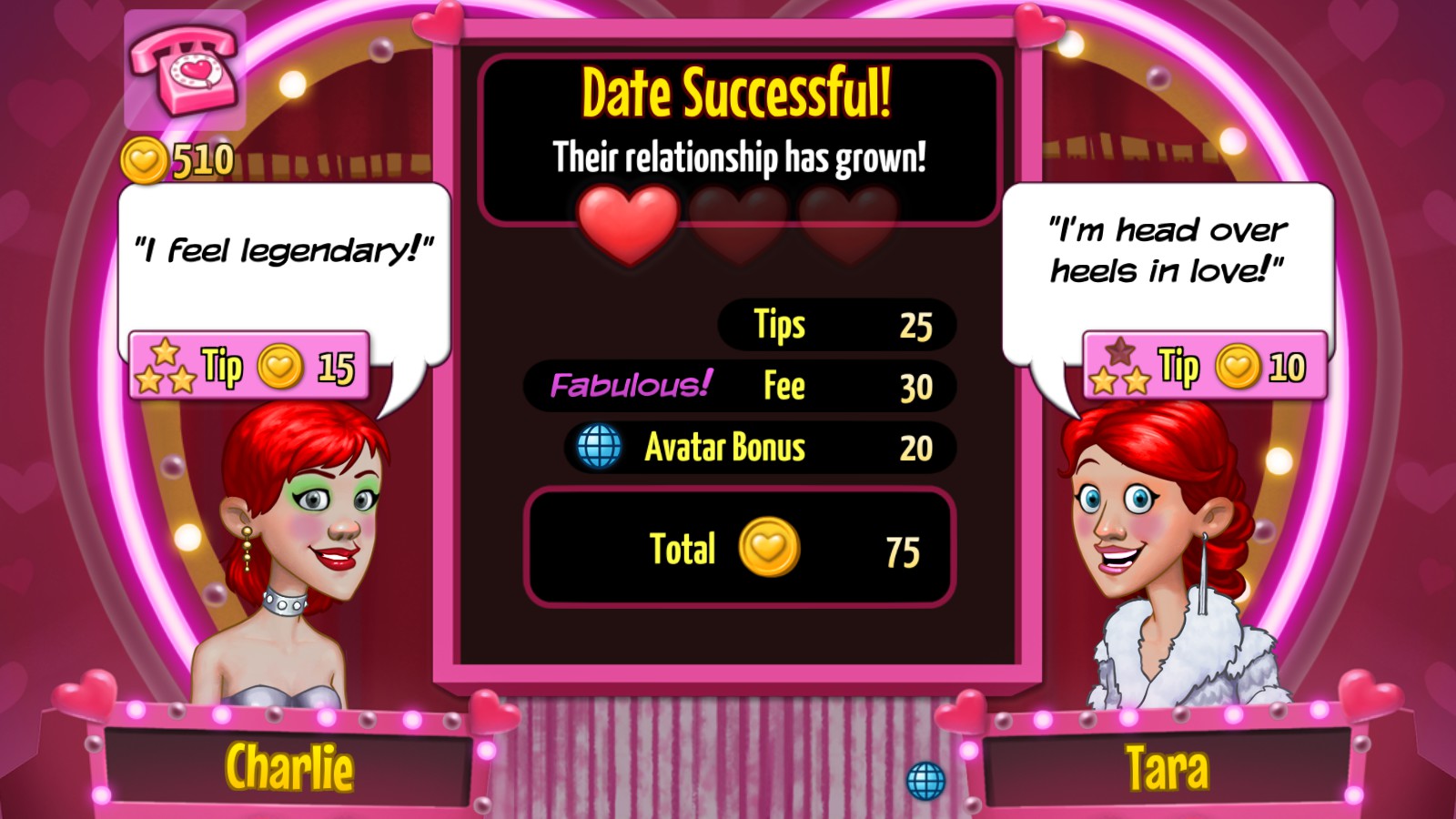 After the date, you get to find out how the pair is feeling about one another, and you get paid based on how well it went. You might also get level up points if you did a really good job, and your reputation will change if it’s a really good date or a really bad date. Then you begin the cycle over again! All of your clients and their dates are procedurally generated. You also have the option of opening your dating service to the avatars of other real life players; matching them up will give you bonus coins at the end of dates. Money lets you upgrade your services, unlocking new restaurants, a salon, and a gift shop.
