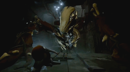 The gameplay shown looked more like an average adventure/explore game — solving puzzles, collapsing bridges, getting stabbed in the gut with a skeleton bone — ending with the surprise visit of this guy.