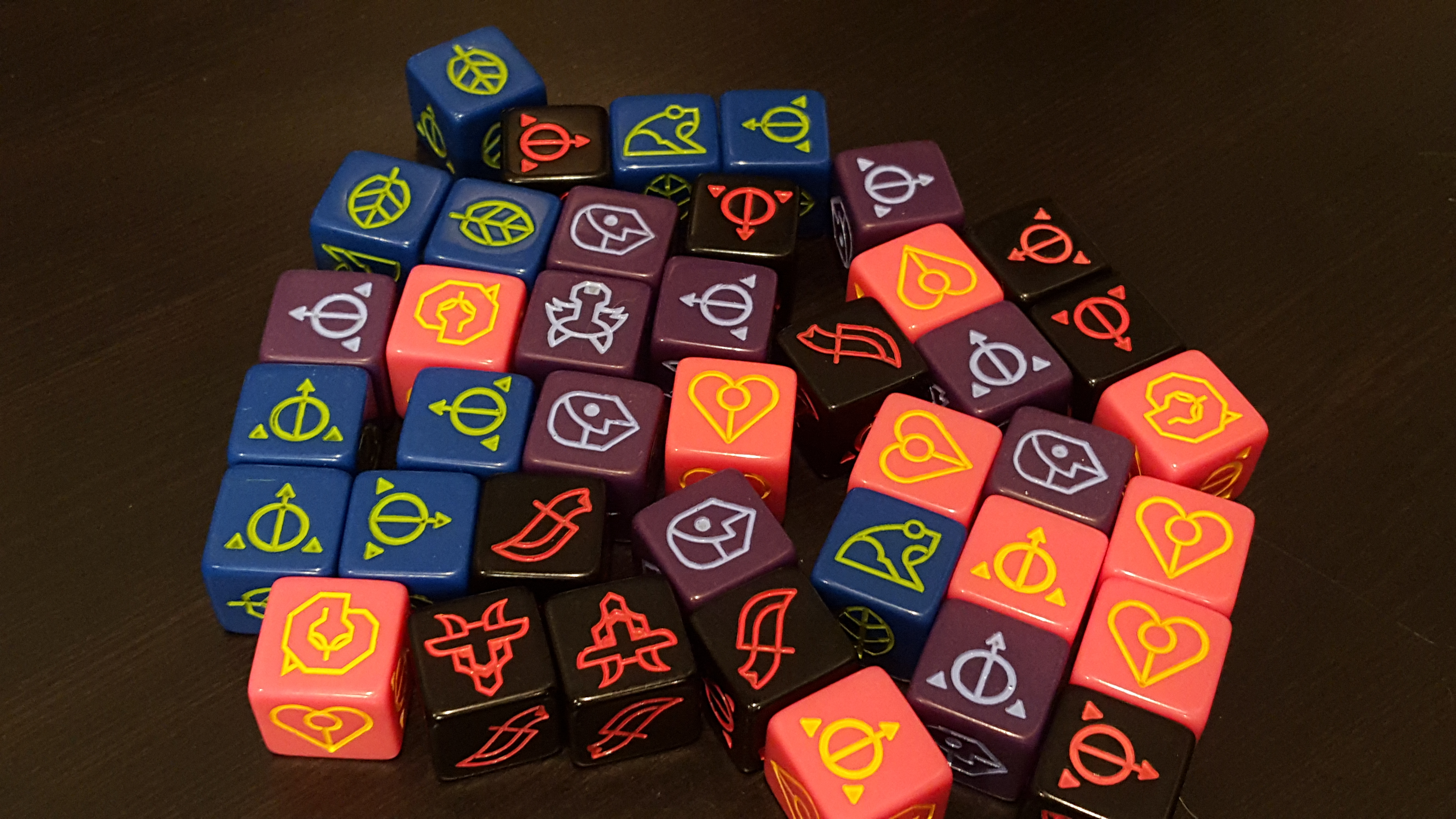 The cards themselves are thick and durable. The 4 sets of 10 dice are unique and really cool looking.