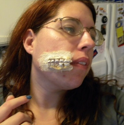 The night of, pull out a crap ton of spirit gum, flesh latex, and makeup to blend, and you have zombie teeth!