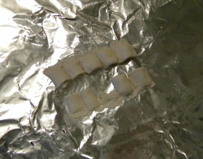 First, put down some tin foil and roll the clay about as flat as you can. Fold the clay over top itself, that nice fold makes for the perfect tooth edge. I cut off small chicklet-sized pieces and used the pressure of my fingers to roll up the sides to make a tooth shape.