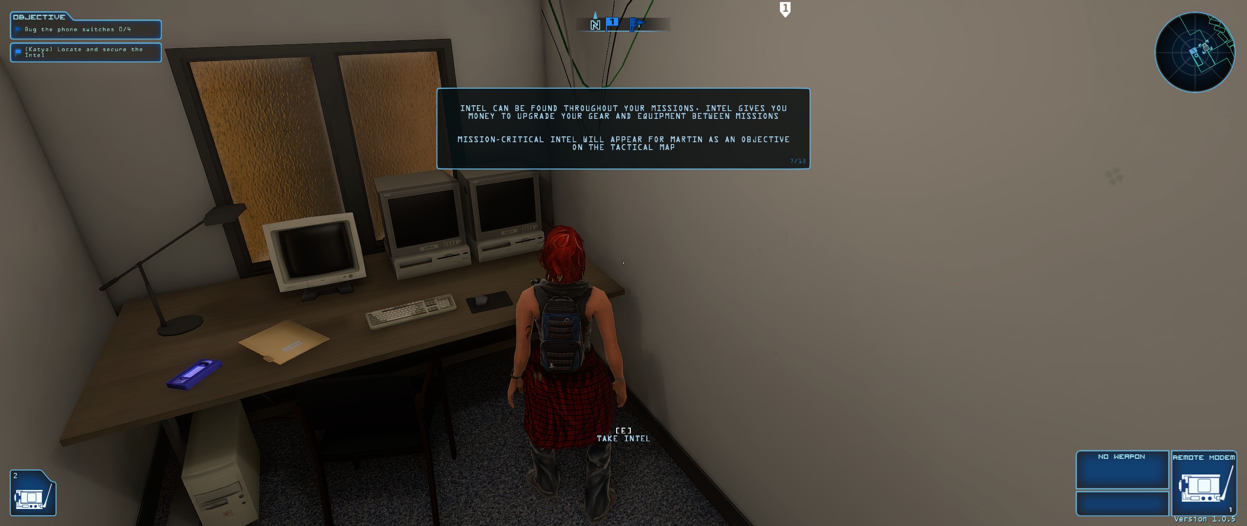 The main gameplay experience involves a ground operative named Katya and her in-the-field hacking partner Martin. Play consists of missions that need to be completed, and it’s absolutely imperative that the two characters work together. In solo play, the player has the ability to switch between Katya’s perspective out in the field and Martin’s at his computer, but rather than have one element of play pause while the player is looking at options with the other, the game continues on in real time. Katya is ultimately the one doing all the acrobatics, take-downs, and killings, and also the one who has to collect physical evidence such as papers, floppy discs, CDs, and more to eventually turn over to their superiors at Kingbridge HQ. However, it’s impossible for her to complete the mission without relying very heavily on Martin, who must hack into the computer networks to adjust the views of video cameras, open locked doors, and access computer terminals in order to help download electronic data to help build the case against their enemies.