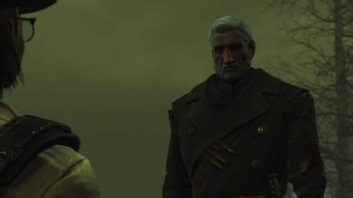 And breathe. Bethesda, you could have done something, anything more interesting than old white gruff guy living alone in his shack. Shit, just making the new companion a woman would have turned your caricature into a character. An older woman, with grey hair, wrapped in the furs of her kills, who doesn’t take crap from anyone. Boom! Ten times more interesting than Longfellow. I’m picturing Mom from Futurama with a harpoon gun. See, already that’s way better.