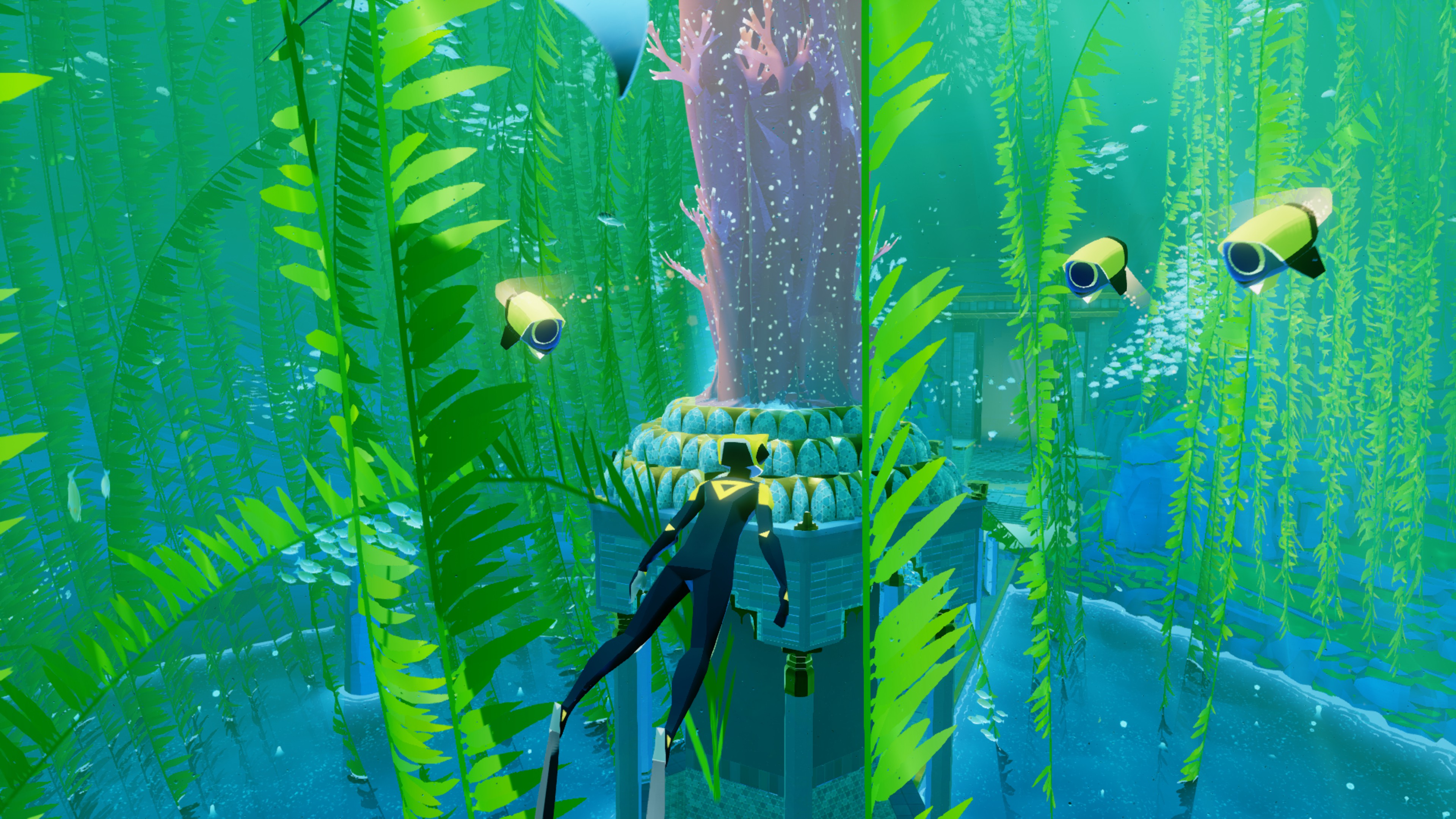 Once you master the controls (a controller is highly recommended, though not required), swimming around the aquatic environments is fluid, fun, and quite relaxing. The environments are varied and well-crafted, taking the Diver on a journey through colorful reef systems, kelp forests, deep-sea caverns, jet streams, dark depths filled with bioluminescent creatures, ancient ruins, and much more. All manner of sea life can be encountered along the way, and while some creatures are scarier than others, at no time in the game do any of them pose a threat to your well-being. Near the beginning of the game, there’s a point where a large great white chomps down on one of your drones (and I admit, it was a bit of a natural jump scare!), but outside of that, most all of the interactions with the sea life are positive (which was one of the goal’s of the game’s designers).