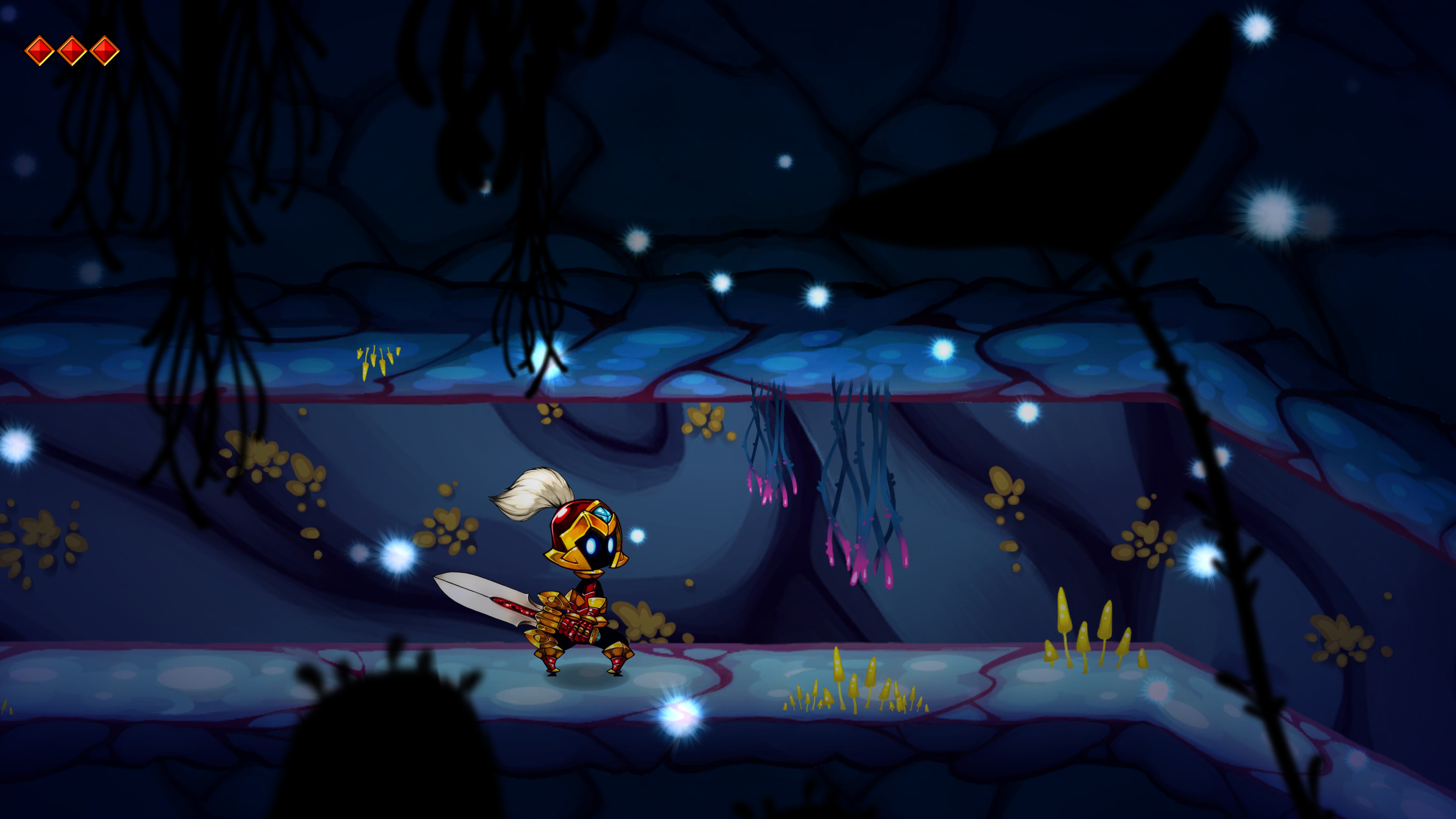 At its core, Pankapu is a vibrant adventure game that consists of 2D platforming through a series of diverse stages. The game presents you with a world map, allowing you to travel to previously visited areas as you desire (if you wish to go back and try to get places you could not reach before or find items you may have missed) and giving you a semblance of progress as you work your way through the game’s story. Each area has a goal of some sort for you to meet, as well as items and upgrades you can collect along the way. In many ways, the game actually reminds me of the Wonder Boy series, which itself drew quite a bit from The Legend of Zelda. Combat is performed primarily with a sword and shield, and blocking is pretty important to your survival. You also start the game with three red gems worth of health, but as you progress, you can find gem pieces that, much like heart pieces in the Zelda games, can combine and provide you with an additional unit of health.