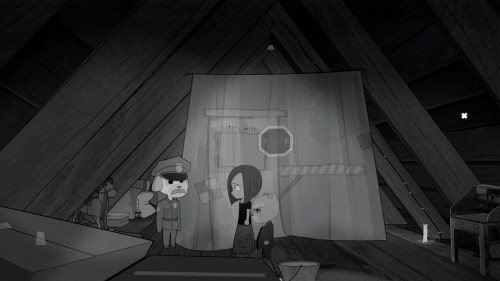 The game is almost entirely in black and white, with spare usage of red for emphasis. I like the art and animation—there are nice touches, such as Ted’s ears twitching. The style is cartoony, but the black and white gives it a more serious tone. Oddly, almost no one has feet—their legs just end, or in Amber’s case are covered by a skirt. The characters who do have feet don’t move, so I think this has something to do with animation. In the first episode, there’s a storm outside, and the lightning flashing throughout the house is well done and adds to the creepy atmosphere. I also liked being able to direct a flashlight with my mouse in a dark room. The second episode starts in a rainstorm, and the rain falling and hitting the windows looks great. The map added for fast travel in episode two is really nicely done as well.