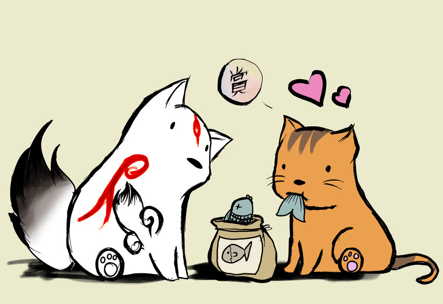 Okamiden, feedbag, fish, cat, video game, gamer girl